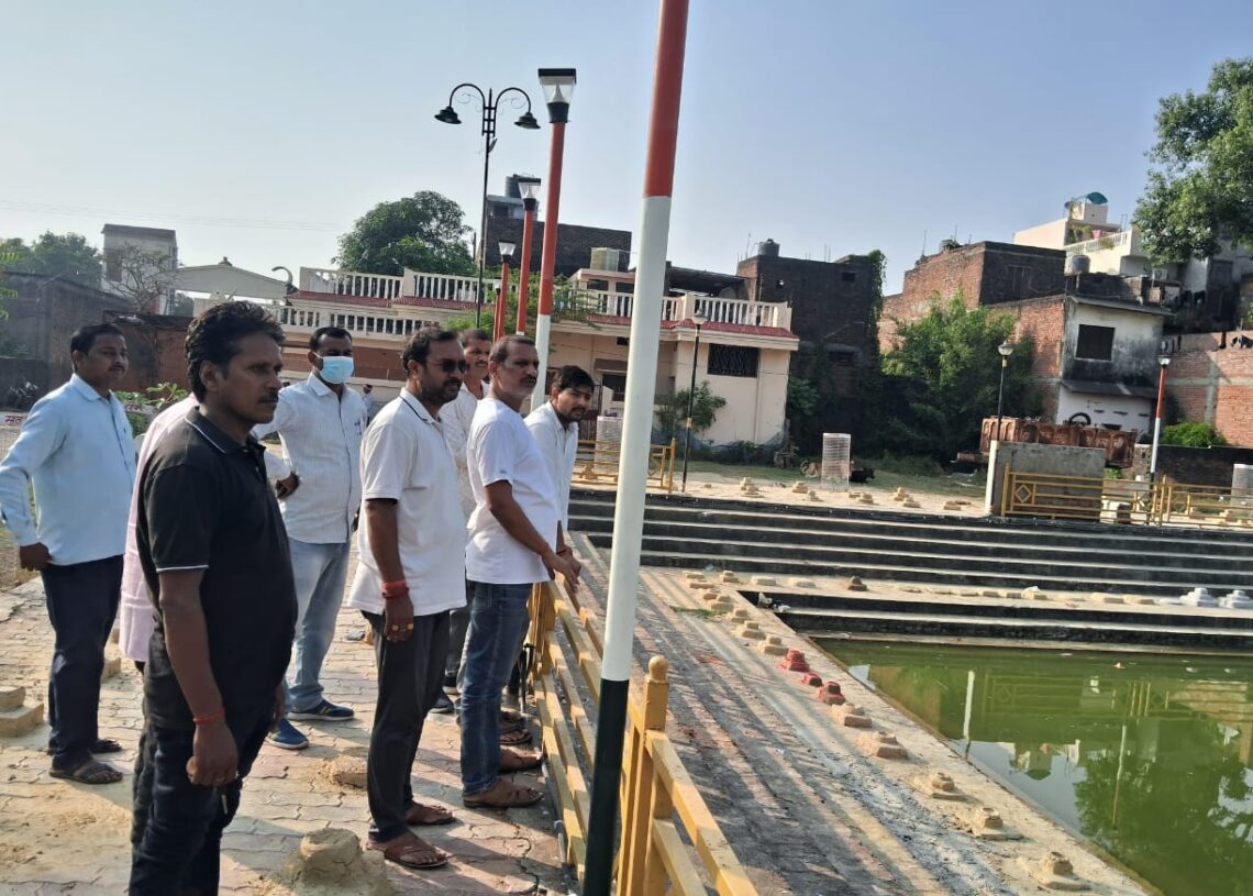 नगर सभासदों के साथ छठ घाट का निरीक्षण करते नगर पालिका चैयरमैन बृजेश मणि त्रिपाठी