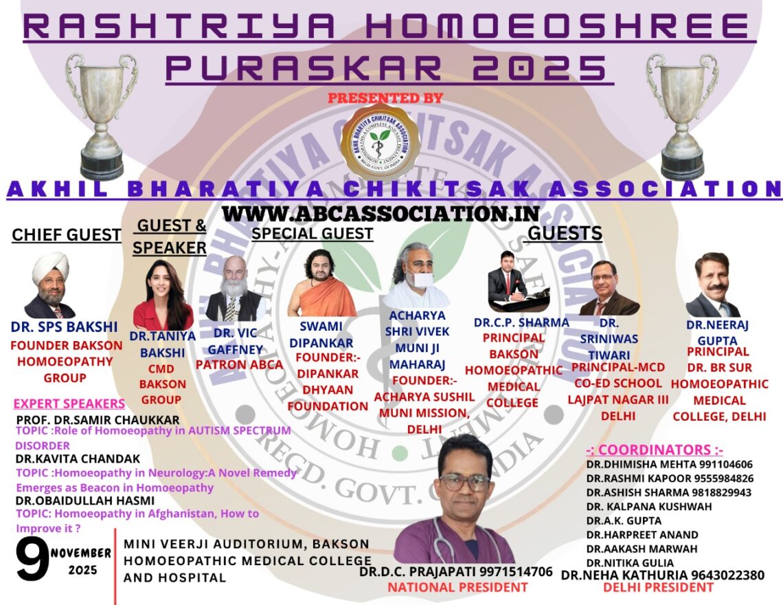 डीबीएस न्यूज, नई दिल्ली। अखिल भारतीय चिकित्सक एसोसिएशन (Akhil Bharatiya Chikitsak Association) द्वारा आयोजित “राष्ट्रीय होमियोश्री पुरस्कार 2025” समारोह का आयोजन रविवार को मिनी वीरजी ऑडिटोरियम, बाक्सन होम्योपैथिक मेडिकल कॉलेज एंड हॉस्पिटल, ग्रेटर नोएडा में किया गया।