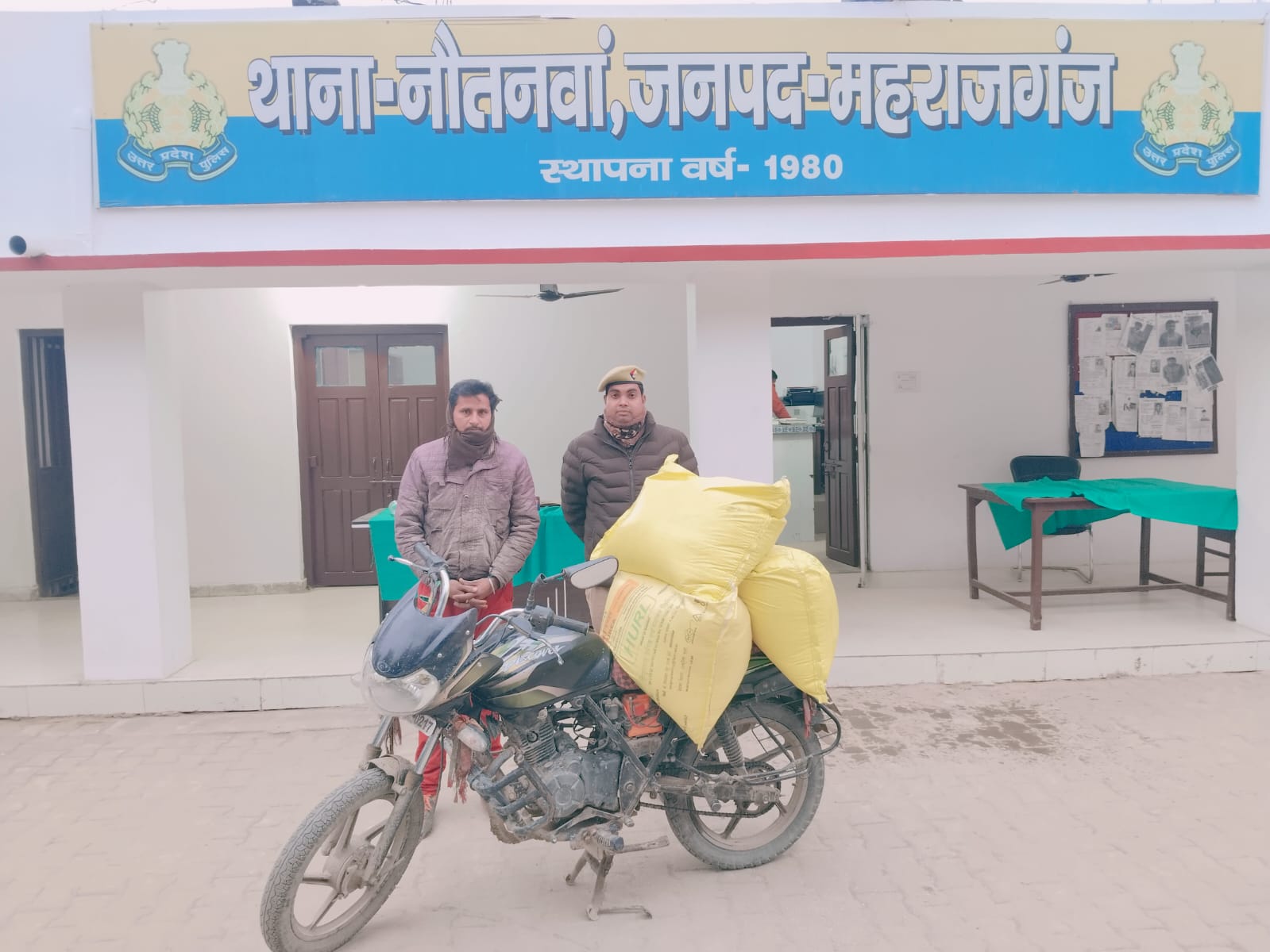 मुखबिर से प्राप्त सूचना के आधार पर पुलिस टीम ने डुड़ा नदी पुल के पास चेकिंग के दौरान एक मोटरसाइकिल संख्या UP 53 BJ 0217 से 3 बोरी यूरिया खाद बरामद की। मौके से आरोपी को गिरफ्तार कर लिया गया। बरामद सामग्री को अग्रिम विधिक कार्रवाई हेतु कस्टम कार्यालय नौतनवां भेजा गया।