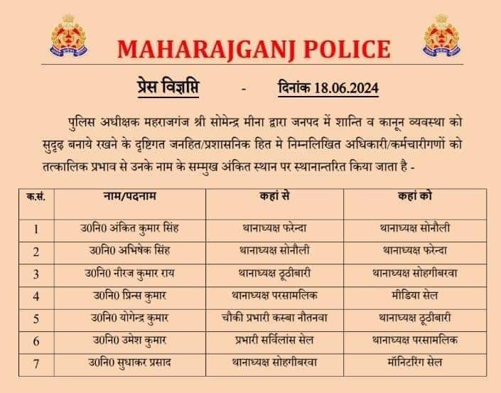 डीबीएस न्यूज, महराजगंज: पुलिस अधीक्षक सोमेंद्र मीणा ने जनपद में कुछ थाना प्रभारी और चौकी प्रभारी के कार्य क्षेत्रों में बदलाव किया है। वहीं कुछ उपनिरीक्षकों को बड़ी जिम्मेदारी देते हुए थाने की कमान भी सौपी है।