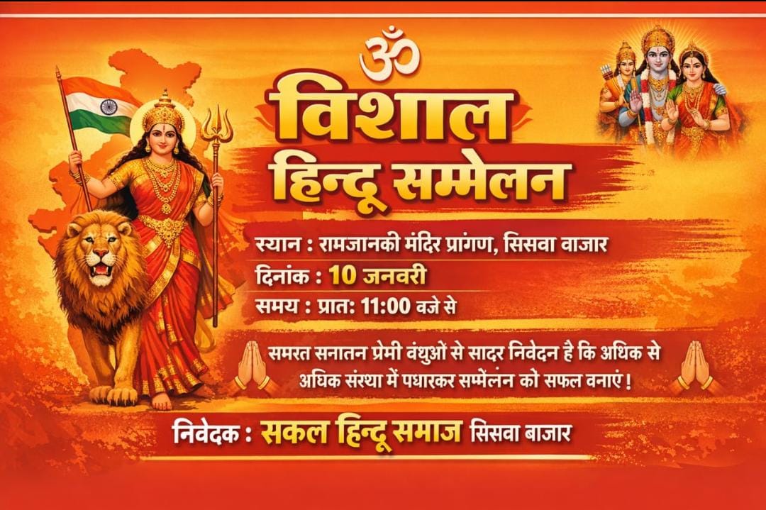 डीबीएस न्यूज, सिसवा बाजार। आज दिनांक 10 जनवरी 2026, शनिवार को प्रातः 11 बजे से सिसवा बाजार स्थित श्री राम जानकी मंदिर, छठ घाट पर विराट हिन्दू सम्मेलन का आयोजन किया जाएगा।