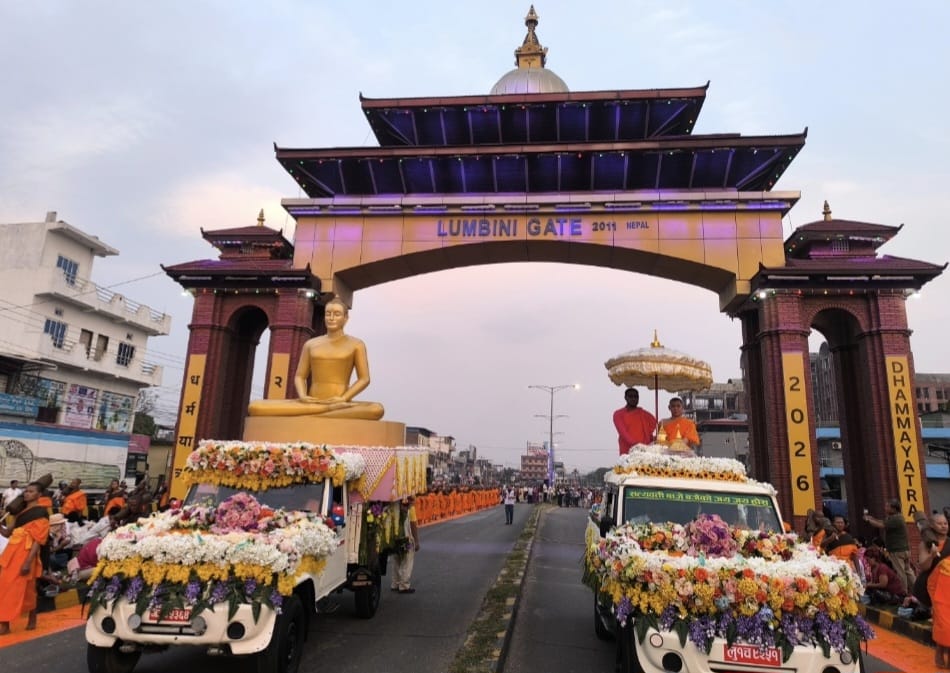 डीबीएस न्यूज, सोनौली।  विश्व में शांति का संदेश देने के मकसद से भैरहवा में शनिवार की शाम तीसरी धम्म यात्रा निकाली गई है। धम्म यात्रा भैरहवा में सिद्धार्थ रंगशाला रोड से बुद्ध चौक में लुंबिनी रोड तक निकाली गई। “500 कुलपुत्र प्रव्रज्या” प्रोग्राम के तहत हुए इस प्रोग्राम में करीब 500 नए दीक्षित साधु-संन्यासियों ने हिस्सा लिया। इस यात्रा ने शांति, दया और साथ रहने का संदेश फैलाया है। भगवान बुद्ध की राजगृह से कपिलवस्तु तक की ऐतिहासिक यात्रा से प्रेरित होकर, इस धम्म यात्रा को न सिर्फ एक धार्मिक रस्म के तौर पर बल्कि सामाजिक बदलाव के अभियान के तौर पर भी पेश किया गया। धम्म यात्रा के दौरान, भगवा कपड़े पहने बौद्ध भिक्षु एक लाइन में चल रहे थे और भिक्षुओं ने अपने कंधों पर अपने निजी सामान से भरे बैग उठाए हुए थे। वे नंगे पैर चल रहे थे, जिससे तपस्या, सादगी और अनुशासन का एक मज़बूत संदेश मिला। जिस रास्ते पर साधु चल रहे थे, उस पर एक खास कपड़ा बिछाया गया था, जिस पर कनखजूरे के फूल के पत्ते बिखरे हुए थे। यह हिस्सा लेने वाले साधुओं के प्रति दिखाए गए सम्मान और भक्ति को दिखाता है। यात्रा के दौरान बोलते हुए, लुंबिनी प्रदेश के सभापति तुलाराम घर्तीमागर ने कहा कि सभी नेपालियों को नेपाल के बुद्ध की जन्मभूमि होने पर गर्व होना चाहिए। उन्होंने समाज में हो रही हिंसक और अमानवीय गतिविधियों पर चिंता जताई, और लुंबिनी को विश्व शांति का केंद्र बनाने की ज़रूरत बताई। आपसी सम्मान, सद्भाव और सहयोग की भावना विकसित करने की ज़रूरत पर ज़ोर दिया और अपनत्व की भावना अपनाने का आग्रह किया। उन्होंने यह भी कहा कि ऐसे आयोजन बुद्ध के अष्टांगिक मार्ग और पंचशील के सिद्धांतों को अमल में लाना है। बुद्ध धर्म से जुड़े अलग-अलग संगठनों के साथ-साथ दर्जनों स्थानीय संगठनों ने धम्म यात्रा में हिस्सा लिया। यह यात्रा बुद्ध की जन्मभूमि लुंबिनी से शुरू हुई। इस यात्रा में 500 भिक्षु शामिल हुए।